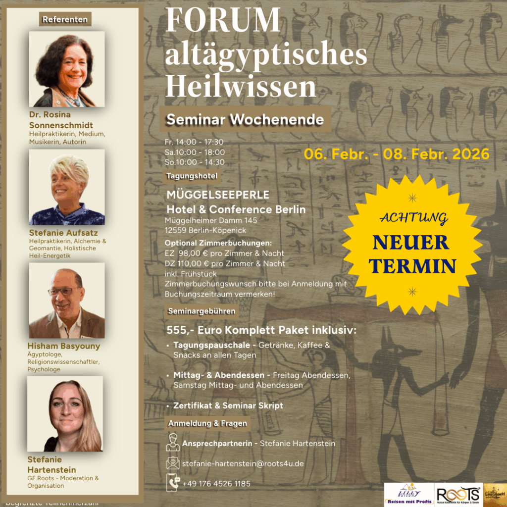 Nach unserem erfolgreichen Seminar zur alt-ägyptischen Aromatherapie im Juni in Pforzheim im Hohenwart Forum, sind wir voller Elan einen weiteren Workshop anzubieten. Gemeinsam mit Fr. Dr. Rosina Sonnenschmidt, Stefanie Aufsatz und Hisham Basyouny haben wir ein inspirierendes Seminar-Wochenende in Berlin organisiert.