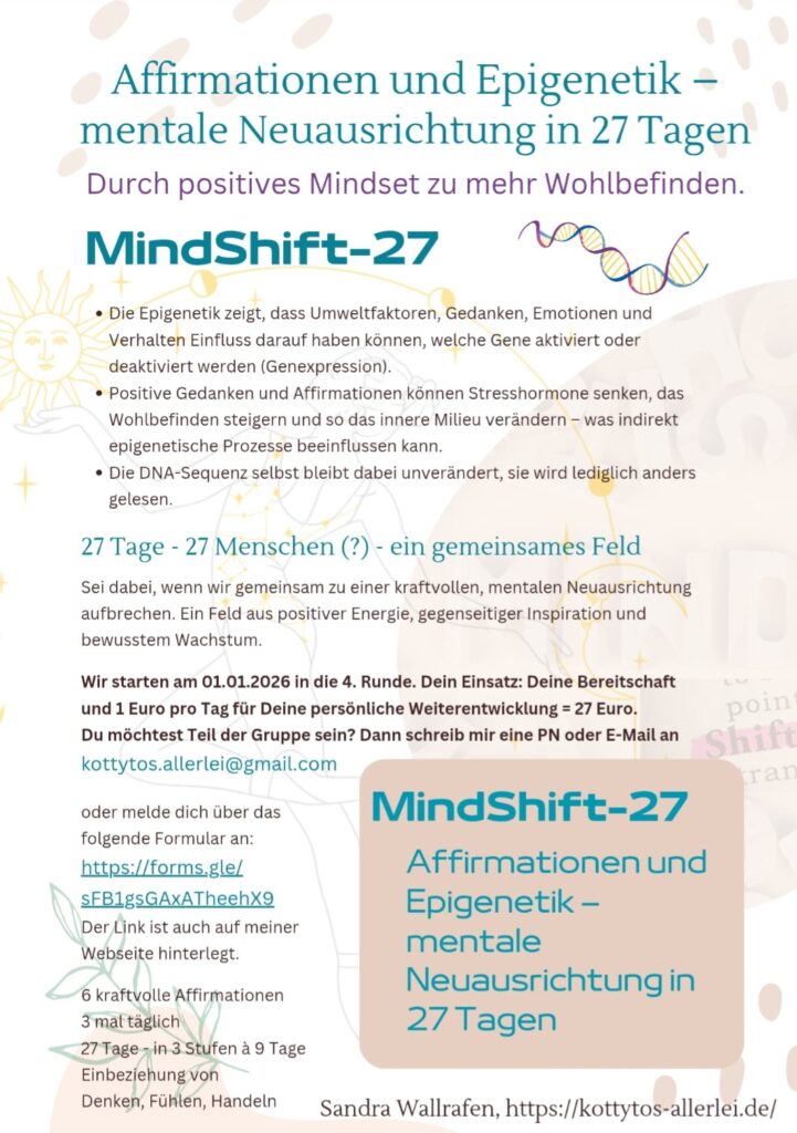 Durch positives Mindset zu mehr Wohlbefinden. Diesem Ziel nähern wir uns durch 3 mal tägliches Wiederholen von Affirmationen und anderen Techniken. Täglich erhältst du einen Impuls und Unterstützung bei Fragen. Die Gruppendynamik animiert zum Durchhalten.