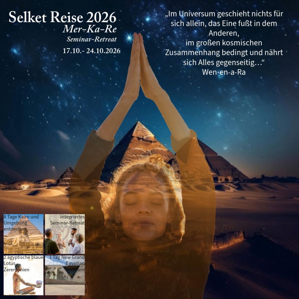 Bewegungsübungen, QiGong & ägyptischer Yoga, Atem- & Klangübungen, geführte Meditationen, der Körper ruht – die Seele reist -bewusste Seelenreise-, Isis die Mutter der Schöpfung, Mer-ka-Re- der Weg der Selket, Kennenlernen & Anwendungen der heiligen Öle der Pharaonen, geführte Blauer Lotus Zeremonien